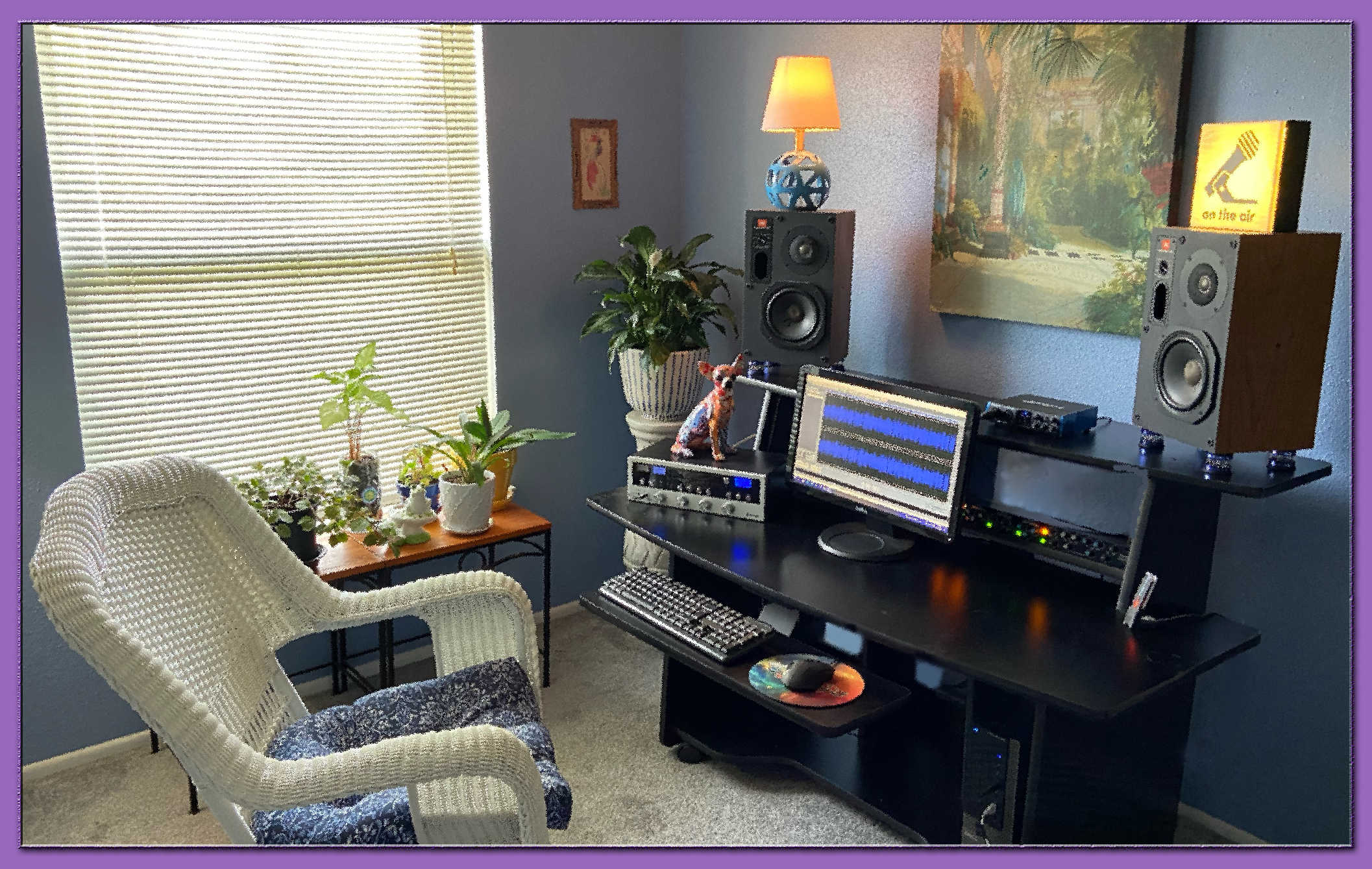 Now…here’s where the magic REALLY happens. Yes, to the untrained eye, it’s a soothing, plant-filled (the Skinny Rocker has quite the green thumb) office; BUT, audio pros know this is where the work begins! Carefully bringing all of these technical elements together into a polished, creative message requires the proper surroundings…and he has created the perfect environment for, well, CREATING audio magic!